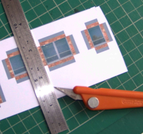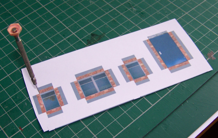 My models often have windows and doors that are rebated - recessed into the walls. I have tried a variety of ways to do this. Slightly recessed fittings are done by simply sticking the door or window behind a cut-out opening, sometimes made a little deeper by laminating another piece of card behind the wall before cutting out the opening.